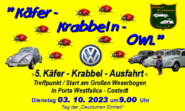 Die 5. Käfer-Krabbel-Ausfahrt mit 18 angemeldeten VW-Käfer ist zum Start bereit ! Alle angemeldeten Teilnehmer möchten doch bitte am 03.Oktober 2023 (Dienstag) pünktlich um 9.00 Uhr auf dem Naturparkplatz am >Großen Weserbogen< mit ihren VW-Käfer'n erscheinen ! DIE AUSFAHRT WIRD PÜNKTLICH UM 9.20 Uhr STARTEN !!! Das "Käfer-Krabbeln" geht über ca. 120 km durch das nord-westliche "Mindener-Lübbecker Land", teilw. auch durch Niedersachsen. Zwischen START und ZIEL sind 4 feste Anfahrts-/Haltepunkte ! Da das am 1. Haltepunkt bestellte"Frühstücks-Mittagsbuffet" ist für die angemeldeten Teilnehmer/Personen bestellt. Der anfallende Verzehrbetrag ist von den Teilnehmern vor Ort selbst zu entrichten. Das Orga-Team wünscht und setzt auch vorraus, daß alle teilnehmenden Käfer / Personen bitte bis zum Ziel (Ende der Ausfahrt, Ankunft um ca.17.15 Uhr ) dabei bleiben !!! Dort ist noch ein gemütliches Beisammensein mit "Gegrilltem & "Getränke" ! MOBILE-KLASSIKER wünscht allen Teilnehmern /-innen nebst Begleitung eine reibungslose Anreise und eine schöne, aber auch unfallfreie Käfer-Krabbel-Ausfahrt 2023 Info unter Telefon 0171 3142020 (E.Rostek) oder 0171 6952089 (D.Knorrenschild) | |||||||||||||||||||||||||||||||||||||||||||||||||||||||||||||||||||