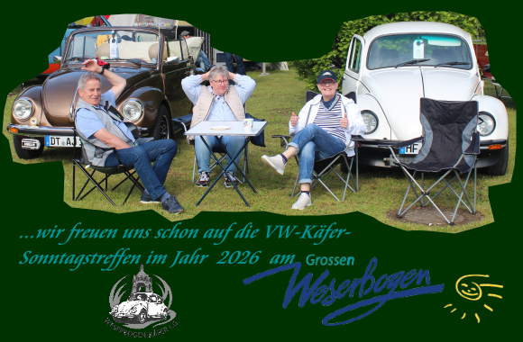 " VW-Käfer - Sonntagstreffen am Großen Weserbogen " *** in den Monaten von APRIL bis OKTOBER *** Jeden " e r s t e n " Sonntag im Monat -bei nicht regnerischem Wetter- findet eine Zusammenkunft von VW-Käfern, statt ! Ab 10.00 Uhr auf dem Naturparkplatz am Großen Weserbogen in 32457 Porta Westfalica / Zum südlichen See, Ende so wie jeder gerne möchte. Für Getränke und Verzehr ist jeder selbst verantwortlich, bei Bedarf selber mitbringen ! Info unter Telefon : 0171 3142020 WESERBOGEN-KÄFER I.G. Vorläufige Termine : So. 05.April 2026 / *So. 03.Mai 2026 / So. 07.Juni 2026 / So. 05.Juli 2026 / So. 02.August 2026 / So. 06. September 2026 / *So. 04. Oktober 2026 / Anmerkung : *Das Sonntagstreffen am 03.Mai 2026 findet n i c h t am Großen Weserbogen statt. Es wird wieder in Verbindung mit dem "Oldtimertreffen an der Mühle" in Levern (03.05.26) stattfinden. Lage / Ort : Mühlengelände Levern, Mühlenweg/Auf d. Imlage, 32351 Stemwede-Levern *Das Sonntagstreffen am 04.Oktober 2026 findet nicht statt, da am 03.10.26 Tags zuvor die "Käfer-Krabbel-Ausfahrt" ist ! WESERBOGEN - KÄFER I.G. --------- Änderungen bzw. Ergänzungen könnten erfolgen ! D. Knorrenschild / MOBILE - KLASSIKER --------- |